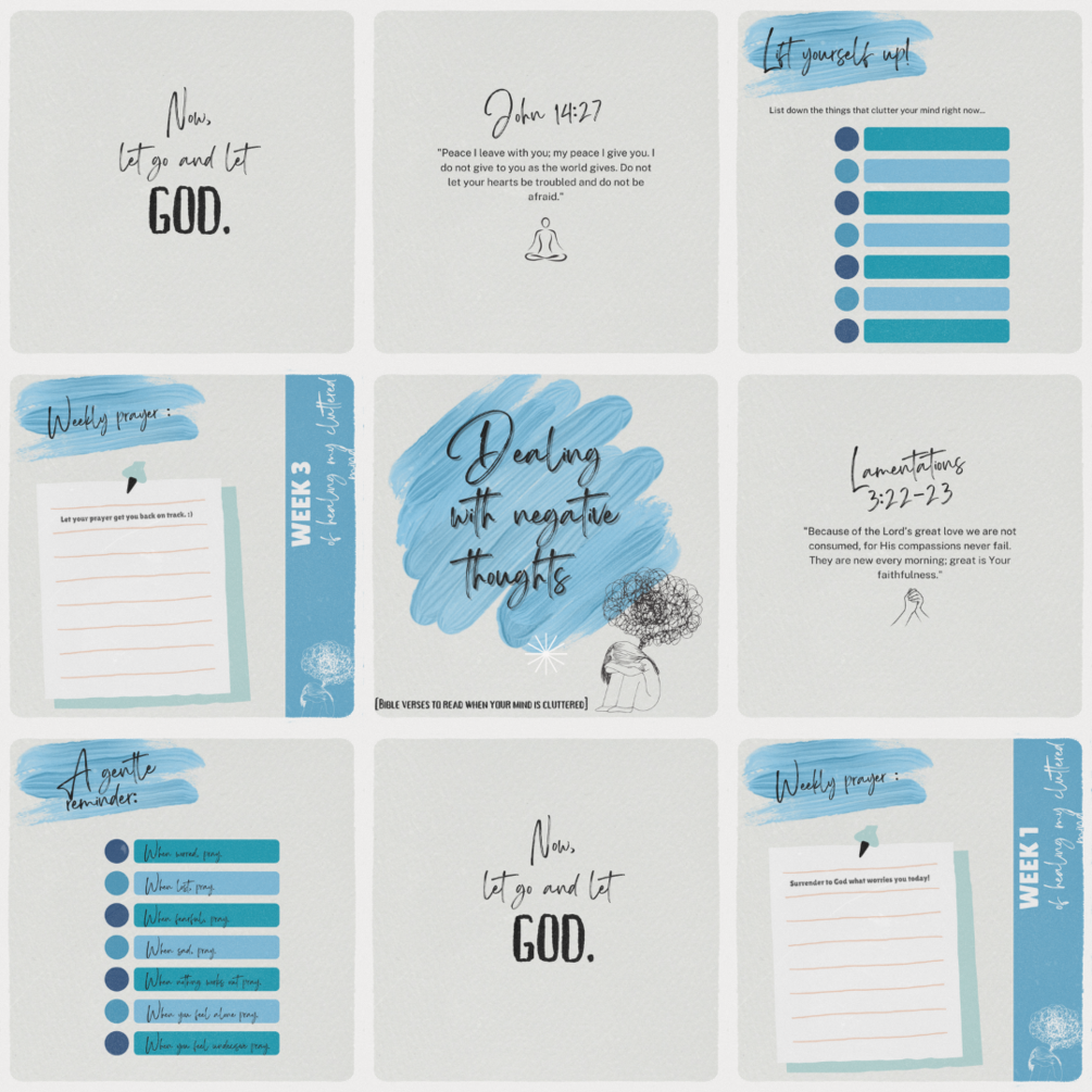 "Dealing with Negative Thoughts: A Simple Journal Template with Bible Verses" is designed for those seeking mental clarity and spiritual peace amidst life's chaos. With straightforward prompts and carefully chosen Bible verses, this journal helps you organize your thoughts and find tranquility. With 4-week prayer devotion, it provides a calming routine that integrates spiritual guidance, supporting a more focused and peaceful mindset.